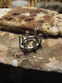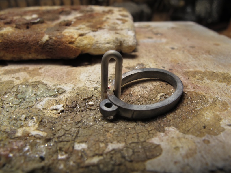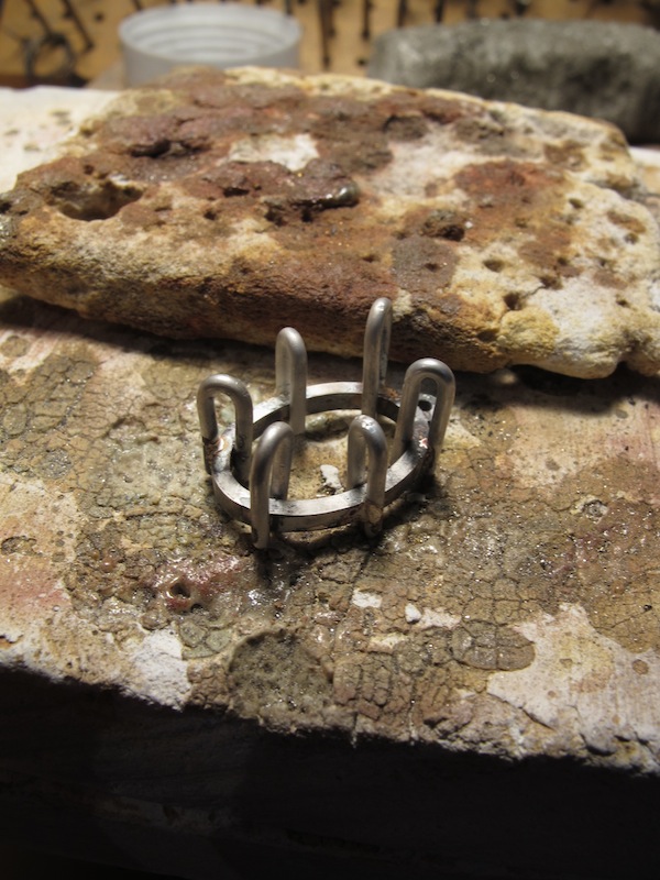 ④ ③でメモをとった2本の爪の距離と同じになるようにコンパスで上下の爪の場所に印をつけて、まず最初の1本目を配置。爪の直径と同じ溝を土台の印のつけた箇所に彫って、U字型に曲げた爪を用意してクリップで挟む感じで設置し、ロウ付けします。(クリップ式に挟むことで、ロウ付け中に爪が動く可能性を排除します)内側に銀ロウがまわってしまわないいように注意。