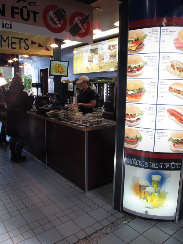 時々どうしても食べたくなるのが旧港市場(Marché de Vieux-Port)の建物中央部分にある小さなフードコートで食べれるサーモンバーガー。