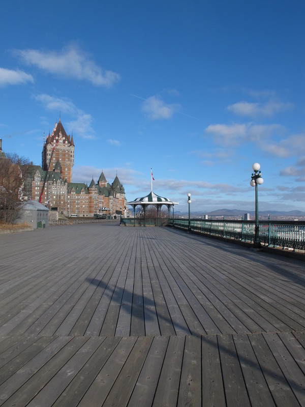 | 「Promenade des gouverneurs(総督の散歩道)」と名付けられた、セント・ローレンス川沿いに続く木の板張りの遊歩道。 |