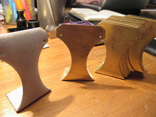 真鍮の板を使って土台を制作するところまでを自分でやって、後は知り合いにクッション詰めと布貼りを任せます。