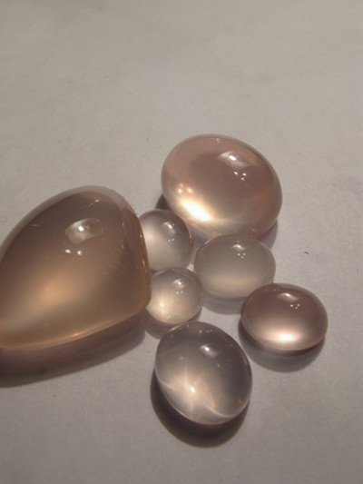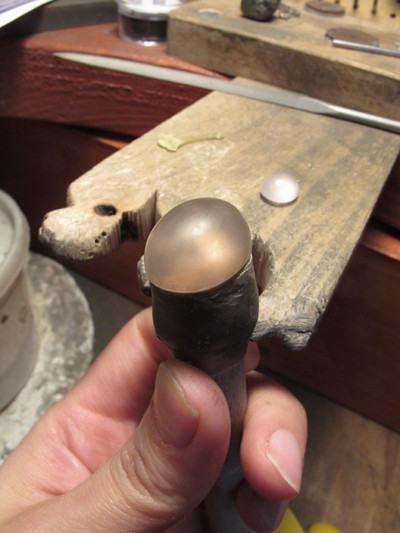 | 段々に削られた状態で適当に磨かれた悲しくも不細工なカボッションカットのローズクォーツ。作業し易いように、専用の樹脂を暖めて石をひっつけます。 |