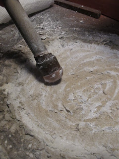 | 石磨き用の白い粉を水と混ぜてフェルトの分厚い板の上でごりごりとひたすら磨きます。 |