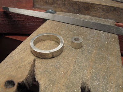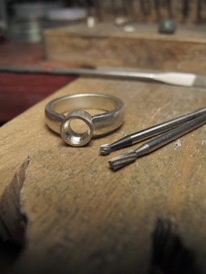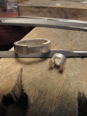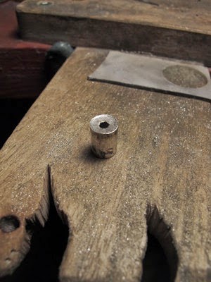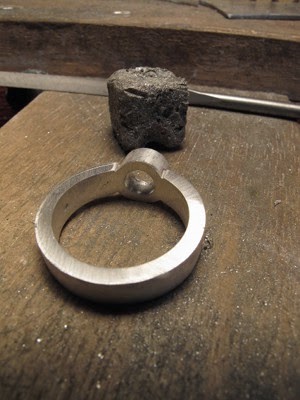 | リングの溶接箇所の真上に石留めチューブをセットします。まずは石留めの直径ピッタリの大きさに平らにやすりがけ。 |