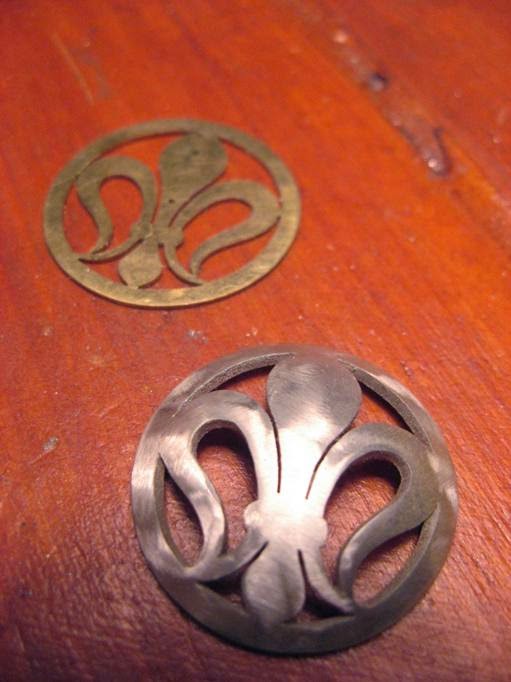 | 一番最初の練習課題の1つ。地金をドーム状に叩いて変形させてから切り抜きます。 |