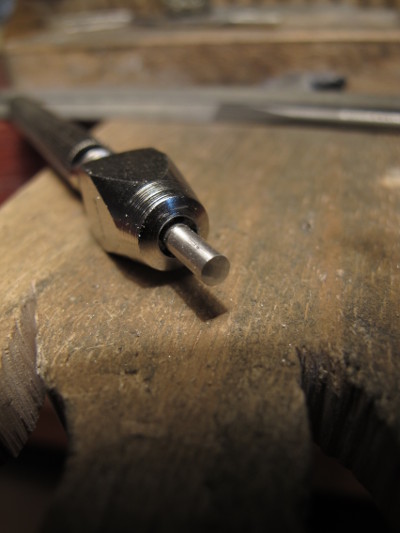 | 銀の丸線からスタートします。必要な長さに切り取る前に、このようにピンバイスでしっかりつかんで線のモチーフを削り出します。(持ち易くしっかり手元で固定できます) |