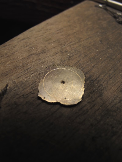 石留めをすると、18Kのその硬さにびっくりします。硬いとわかっているので、あらかじめ銀のときよりも厚みを薄くするのですが、それでも全身あせびっしょりになって腕をプルプルさせ、全力で押さないとびくともしてくれません。