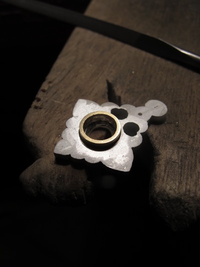 手間をかけてわざわざ石留めの金パーツを「はめこむ」ことで、中心がずれない、溶接のつなぎ目が綺麗、などのメリットが生まれます。めんどくさいように見えますが、仕上がりのシャープさに違いがでるので遠回りの価値ありです。
