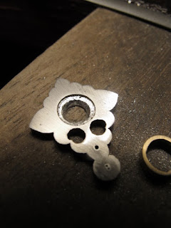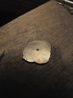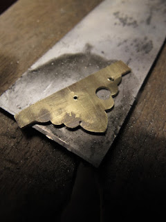 | No.1の方のペンダントの時に紹介し忘れましたが、このように半分だけの型を真鍮板で切り取ってみつロウで貼り付けラインをひきます。もう半分は型にあけている2点を軸とし真鍮型を裏返してもう一度貼り付け、ラインをひきます。こうすることで、左右が確実に対象なモチーフができあがります。 |