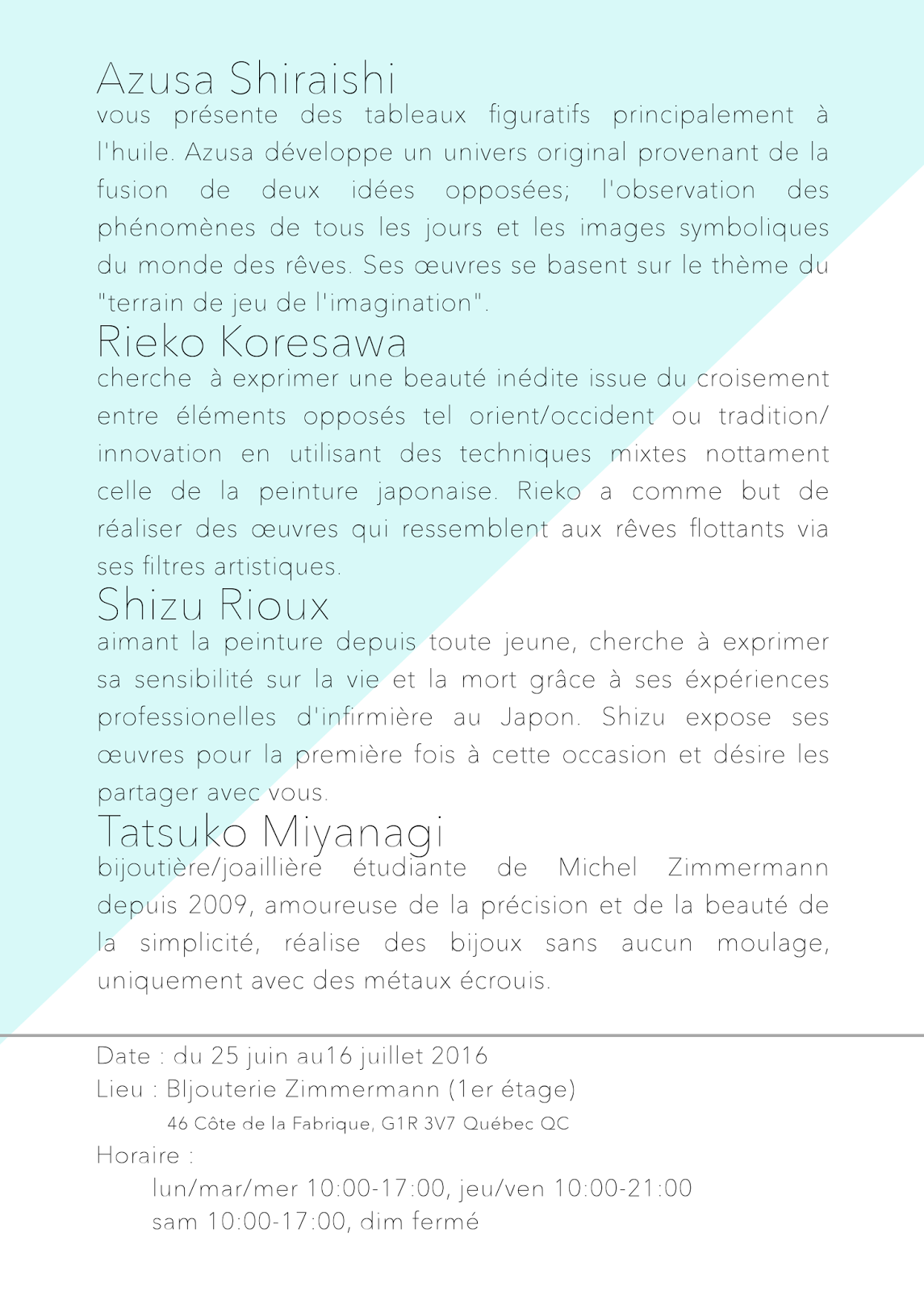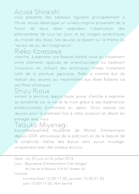 さてさて、きたる6月25日(土)から7月 16日(土)までの3週間、ケベックシティの師匠のお店で