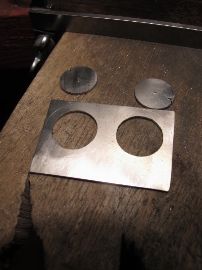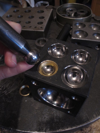 | ダイスに上で切った輪をはめ矢坊主とハンマーで叩いて立体にしていきます |