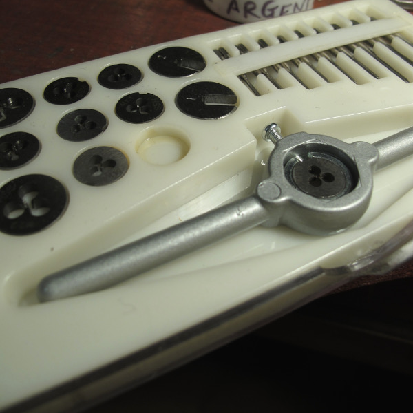 | 金属線を雄ねじ加工するダイス(写真左の丸いパーツ。直径ごとに1/10mm刻みに分かれています)をハンドルに固定して使います。 |